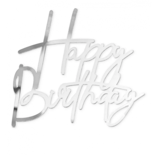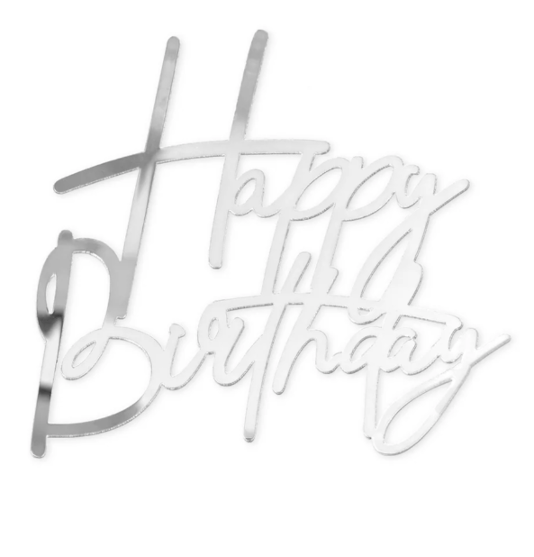 Eleganter und moderner Geburtstagsstecker „Happy Birthday“ von der Marke Party Pal in silberner Spiegeloptik, geeignet für die Seitenseite der Torte, einzeln verpackt einschließlich Grundauflage.