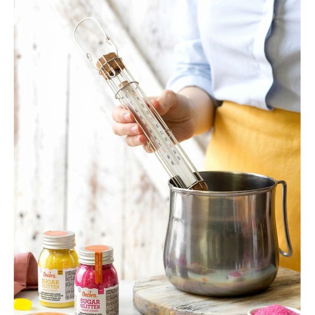 Backformen-Thermometer mit Messbereich +80° +180° ist zum Beispiel geeignet, um die Temperatur von Karamell zu messen. Dieses Konditorei-Thermometer wird nicht in die Spülmaschine gestellt und auch nicht in den Ofen, es besteht die Gefahr des Zerbrechens.