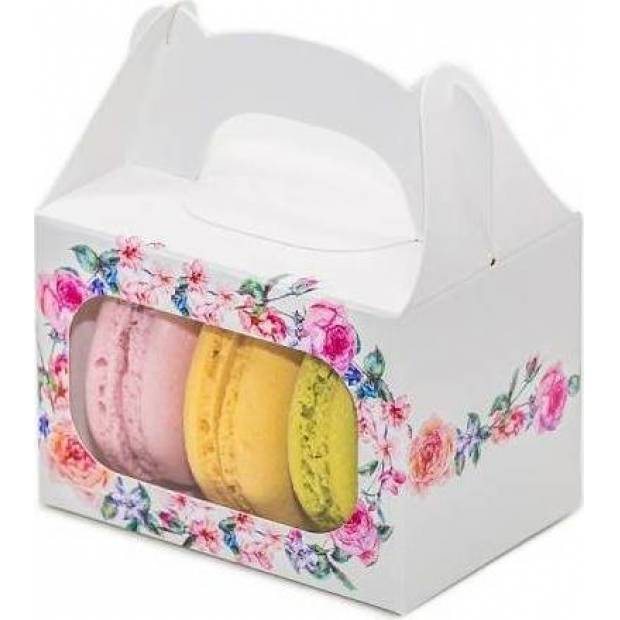 Hochzeitsmakronenbox weiß mit Blumen (8 x 5,7 x 5,7 cm) K12-2089-01