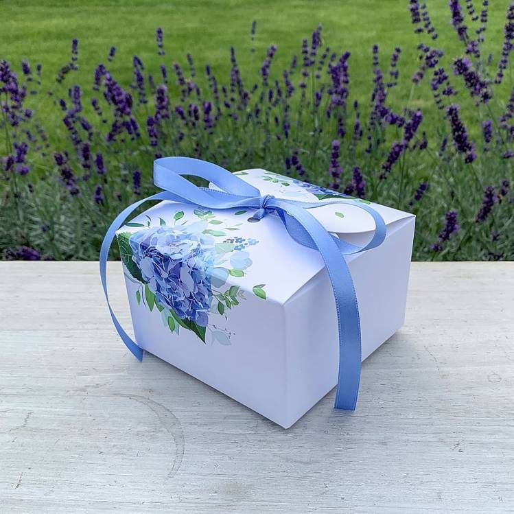 Pro tuto krabičku v romantickém stylu bude mít slabost asi každá něvěsta! Úžasná papírová svatební krabička s hortnziemi je vhodná na svatební koláčky. Je vyrobena z potravinářské lepenky, která má atest pro přímý styk s potravinami. Krabička je uzavřena stuhou, která je v tónu motivu. Svatební krabičku dodáváme v rozloženém stavu, se stuhou příslušné délky.