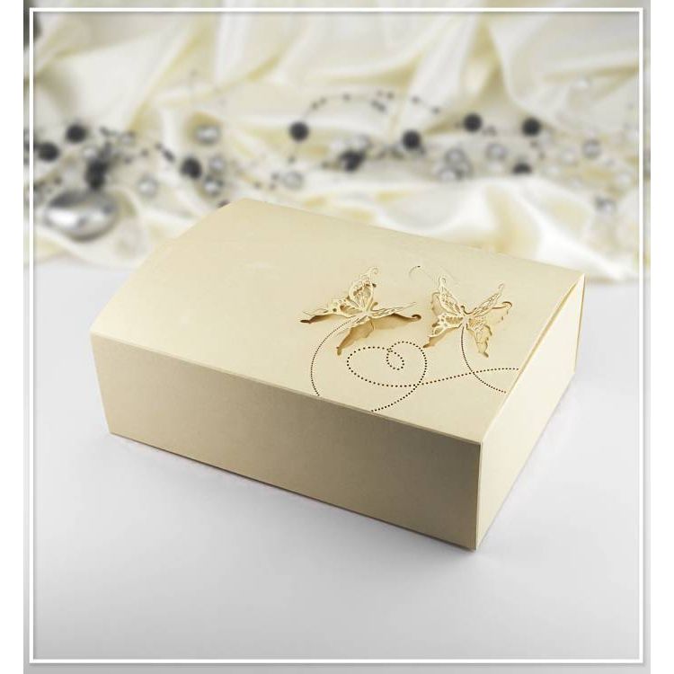 Zlatavá netradiční krabička na výslužku se svatebním cukrovím, koláčky vyrobená z probarveného grafického papíru. Vrchní klopa zdobená motivem motýlků vytvořeným laserovým výsekem. Dovnitř se vkládá zvýšené dno z certifikované potravinářské lepenky.