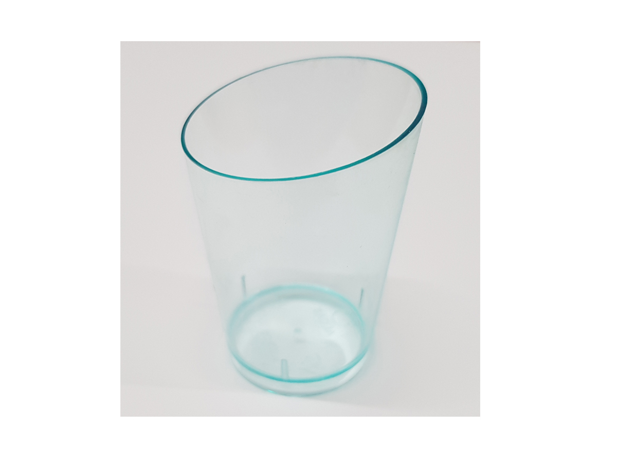 Der eckige Becher hat abgeflachte Seiten und dank dem Herstellungsmaterial (PS), das an Plexiglas erinnert und einen grünlichen Hauch hat, spiegelt dort Licht interessant wider und erzeugt regenbogenartige Reflexe. Der Becher hält Temperaturen bis maximal 40°C. Heiße Speisen nicht darin servieren. Abmessungen: 7,2 x 7,2 x 7,9 cm.