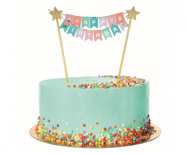 Deko für Kuchen. Bunter, pastellfarbener Stab mit den Worten alles Gute zum Geburtstag. Der Stab in Form einer bunten Girlande, die zwischen goldenen Röhrchen hängt. Abmessungen: Höhe ca. 27 cm.
