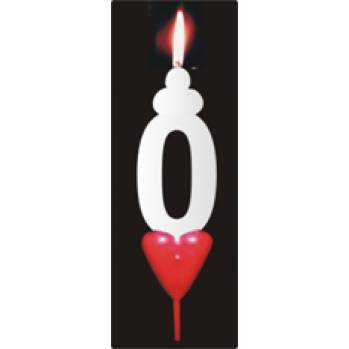 Originale "Pokrova" Kuchenkerze mit Kreuz-Dekor auf der Oberseite der Zahl Null. Die Kerze hat einen Plastikfuß in Form eines roten Herzens. Die Kerzlänge beträgt 5,5 cm. Die Höhe des Plastikfußes beträgt 3,5 cm.