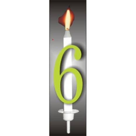 Klassische Tortenzünderkerze mit einer Plastikdekoration in Form einer neon-gelben Zahl sechs. Die Länge der Kerze beträgt 8,8 cm, die Breite 8 mm. Die Reflektorzahl hat die Abmessungen 4,6 x 3 cm. Im Paket finden Sie neben der Kerze auch einen Plastikstän