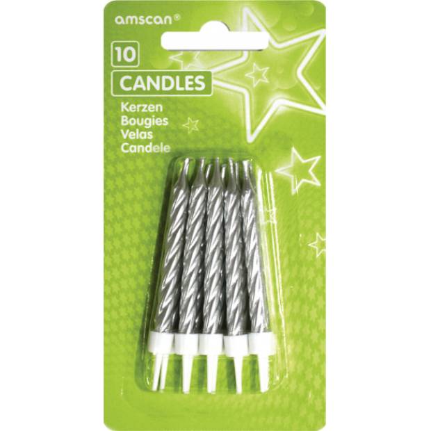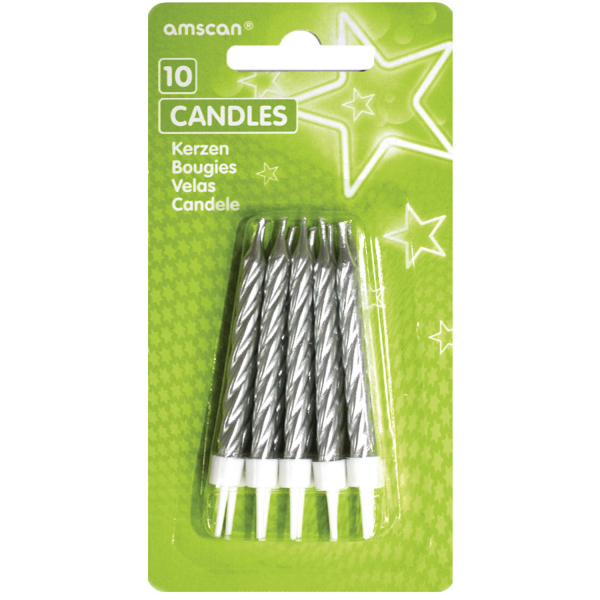 Silberne Geburtstagskerzen zum Dekorieren von Kuchen. Die Kerze können Sie auch in Cupcakes, Muffins oder Roladen stecken. In einer Packung 10 Stück.