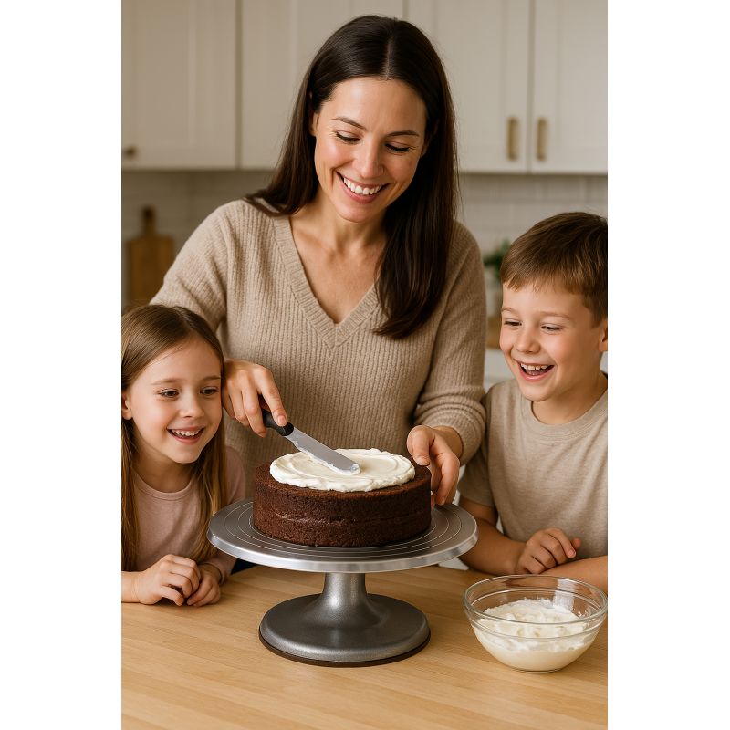 Sanftes Drehen - Der Teller bietet sanftes und gleichmäßiges Drehen, sodass Sie die Torte in einem Zug dekorieren können, ohne Reelungen. Das Ergebnis ist eine perfekt glatte Oberfläche und präzise Details.