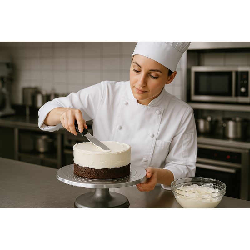 Dieser drehbare Tortenteller wurde so gefertigt, dass er den Bedürfnissen eines Profi-Tortendekorateurs oder Patisserie-Betriebs entspricht und ist die perfekte Ergänzung für Ihre Bäckerei, Ihr Café, Ihr Restaurant oder Catering.