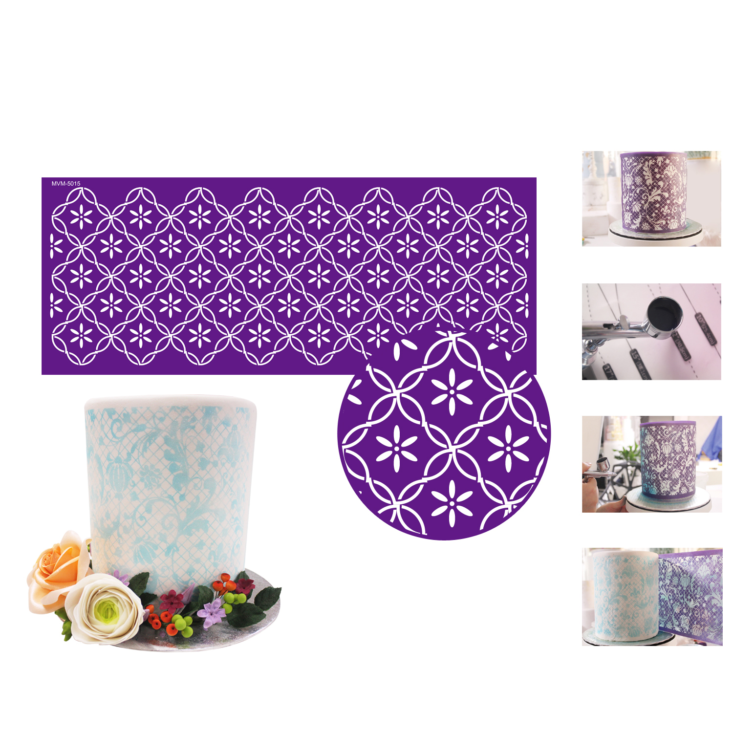 Professionelle Vorlage zum Dekorieren von Kuchen ist geeignet für Schablone und Airbrush. Es ist notwendig, sie fest auf den Kuchen zu legen und während des Auftragens der Farbe nicht zu bewegen. Nur so wird das Muster absolut makellos.