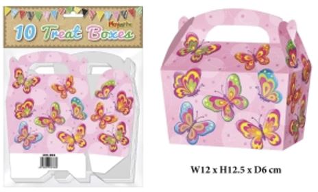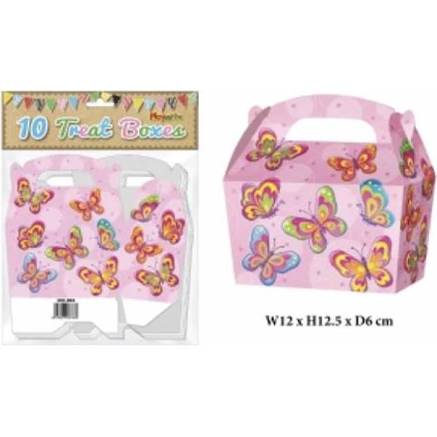 Treat Boxes, kleinere Version unserer weiterhin beliebten Party-Schachteln für Essen. Versealut in 10er-Beuteln mit Kopfband. Geliefert in flacher Verpackung, leicht zu öffnen und geschlossen sowie durch seitliche Tragegriffe abgedichtet. Nach dem Zusammenklappen haben diese Snack-Boxen die Abmessungen 12 x 12,5 x 6 cm.