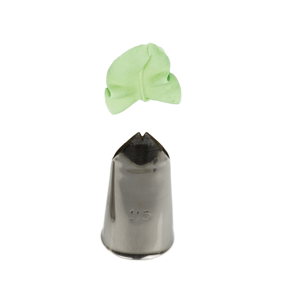 Metall-Pâtisserie-Verzierungs Spitze 115 für Blätter garantiert präzente und einzigartige Dekoration. Die Spitze kann wiederholt mit einer Spritztüte verwendet werden. Sie besteht aus Edelstahl, Fettflecken hinterlassen keine Spuren auf der Oberfläche. Nicht spülmaschinengeeignet.