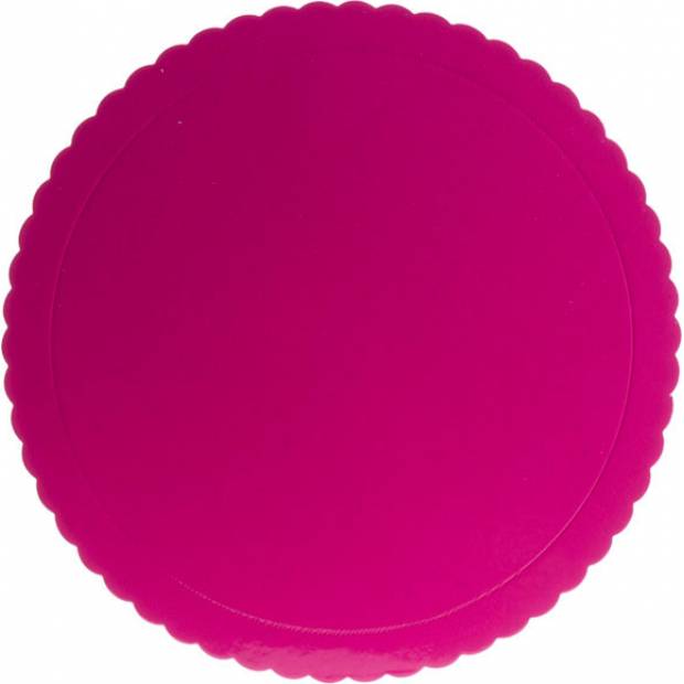 Tortenunterlage erleichtert das Transportieren und Präsentieren. Die Unterlage mit einem Durchmesser von 25 cm besteht aus festem Karton. Sie hat verzierte Kanten, in Fuchsia gehalten. Geeignet für Torten und kleinere Backwaren.
