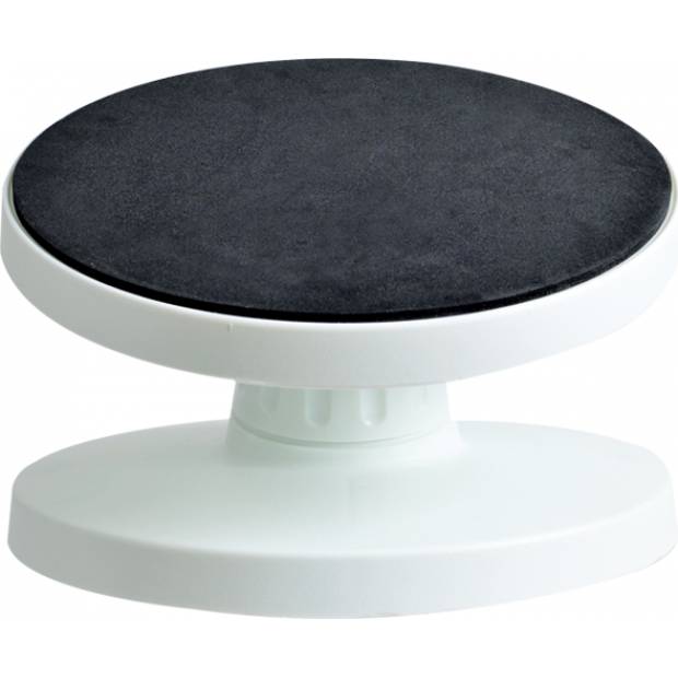 Weiße Kunststoff-Drehteller mit schwarzer antihaftbeschichteter Oberfläche auf der Oberseite, hält jede Torte an Ort und Stelle, selbst wenn der Drehteller geneigt ist. Rutschhemmende Punkte an der Unterseite dieses Drehtellers sorgen dafür, dass er sich während des Dekorierens nicht auf der Arbeitsfläche bewegt.