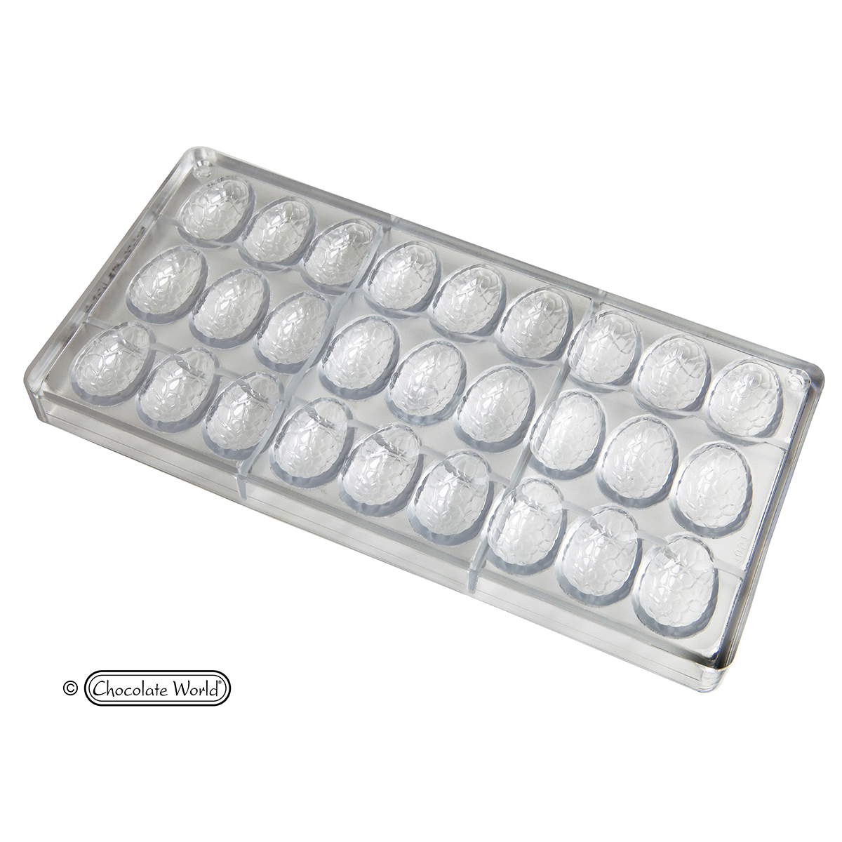 Polycarbonatformen Chocolate World werden von professionellen Chocolatiere weltweit verwendet. Chocolate World ist weltweit führend auf dem Markt für Polycarbonatformen aus Schokoladen für professionelle Chocolaterien und bietet das größte Standard-Sortiment an Formen weltweit. Jede Form wird in Belgien unter Einsatz hochglanzpolierter Werkzeuge gemäß ISO-zertifizierten Produktionsnormen hergestellt und einer menschlichen Qualitätskontrolle unterzogen. Die Polycarbonatform ermöglicht die Herstellung perfekter Schokolade. Diese hochwertige europäische Form ist einfach zu verwenden, Ihre Schokolade wird eine glänzende Oberfläche haben und sich leicht lösen lassen. Um farbige Schokoladenstücke zu erhalten, bestreichen Sie die Form vor dem Befüllen dünn mit farbiger Kakaobutter. Das Design dieser Form ermöglicht das Formen perfekter Figuren mit glatten bearbeiteten Linien.