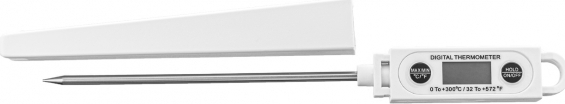 Universelle Temperaturmessgerät hilft Ihnen, die Temperatur von Lebensmitteln, Luft... Digital, mit Abdeckung, misst sowohl in °C als auch in °F. Misst 0 °C bis 300 °C, 32 °F bis 572 °F. Genauigkeit +- 1 °C bei 0 °C – 100 °C und +- 2 °C bei 100 °C – 300 °C. Minimum- und Maximumspeicherung. Betrieb mit 1x LR754 (im Produkt enthalten). Abmessungen: Länge 20 cm.
