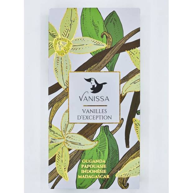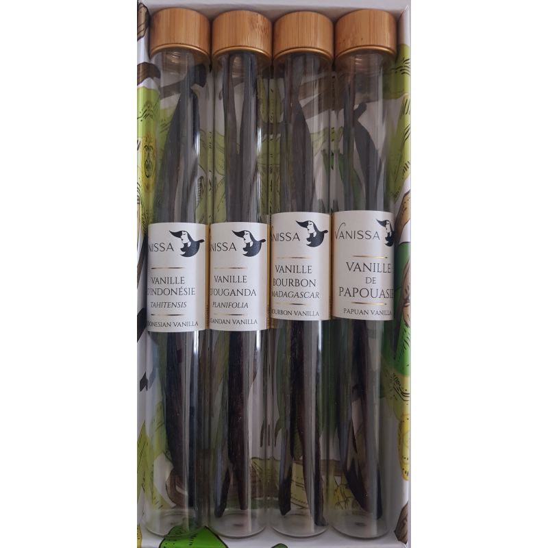 Entdecken Sie die fesselnde Welt von Vanissa durch unser exklusives Entdeckungsset, das aus vier sorgfältig ausgewählten Boxen besteht, die Sie auf eine Reise in das Herz der feinsten Geschmacks- und Duftrichtungen nehmen: Madagassische Vanille (2 Bohnen): süß, kakaig, kremig und ultravanillige Töne. So Vanille, wie Sie sie sich vorstellen. Ugandische Vanille (2 Bohnen): tief, intensiv, wildes Aroma. Vanille mit Charakter. Indonesische Vanille (2 Bohnen) sanft, holzig, pflanzlich im Geschmack. Perfekt süß oder salzig. Papuanische Vanille (2 Bohnen) Noten von Karamell, kandierten Früchten, Blumen, Honig... all der Reichtum der Vanilla Tahitensis. Diese Box bietet Ihnen eine einzigartige sinnliche Reise mit der Auswahl von 8 Vanillebohnen aus 4 verschiedenen Herkunftsländern. Jede Bohne wurde aufgrund ihres außergewöhnlichen aromatischen Profils ausgewählt, das ein unvergessliches geschmacksintensives Erlebnis verspricht. Für Vanilleliebhaber ist diese Box geradezu ein Must-have, um sie auszuprobieren.