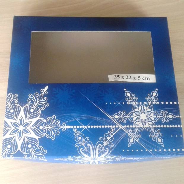 Luxus-Papierbox für Süßigkeiten blau mit Druck. Abmessungen 25 x 22 x 5 cm.