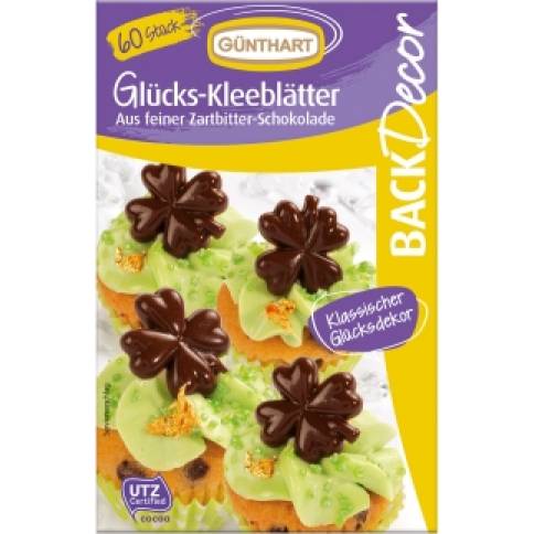 Dekorative Schokoladendekorationen in Form von vierblättrigen Kleeblättern zur Ergänzung Ihrer Torten- und Cupcake-Dekorationen. Dekorieren Sie Ihre Torten im professionellen Stil mit charmanten vierblättrigen Kleeblättern aus Schokolade. Insgesamt sind 60 essbare vierblättrige Kleeblätter enthalten.