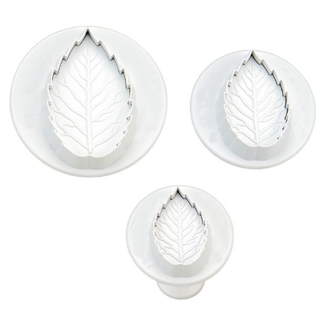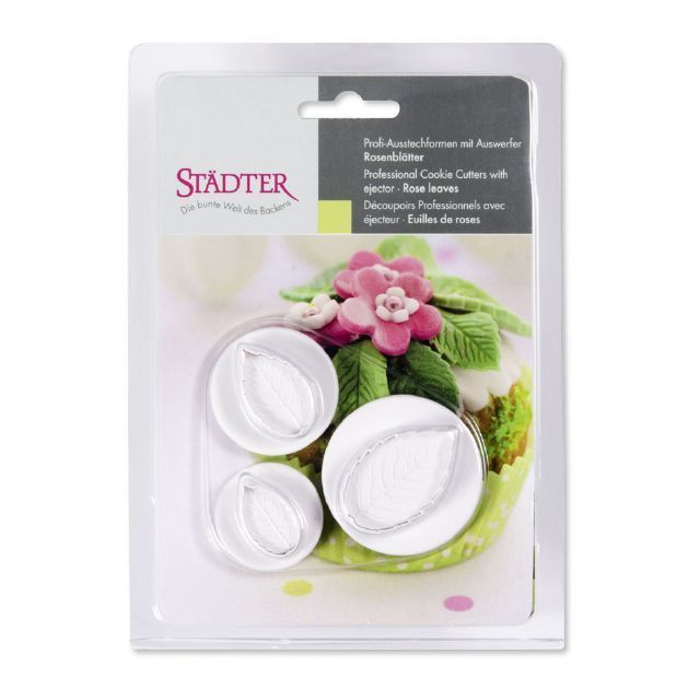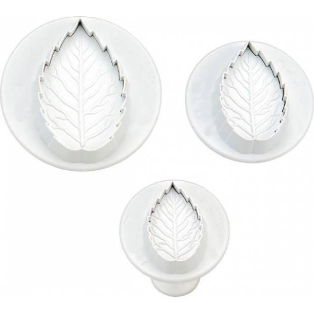Sada 3 ks plastových pístových vykrajovátek ve tvaru listů růže . Zdobení dortů nebo zákusků je snadné. Vykrajovátko položíte na rozválenou hmotu, listy vykrojíte bez stlačení pístu - pouze přimáčknutím obvodu vykrajovátka. Vykrojený tvar zůstane uvnitř a pomocí pístu jej vymáčknete ven. Pomocí vykrajovátka můžete přímo zdobit dort - vykrajovátko s vykrojeným tvarem přiložíte na povrch dortu a jen stlačíte píst.