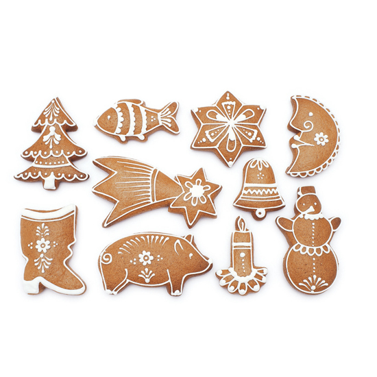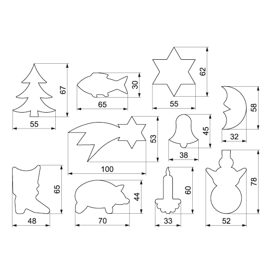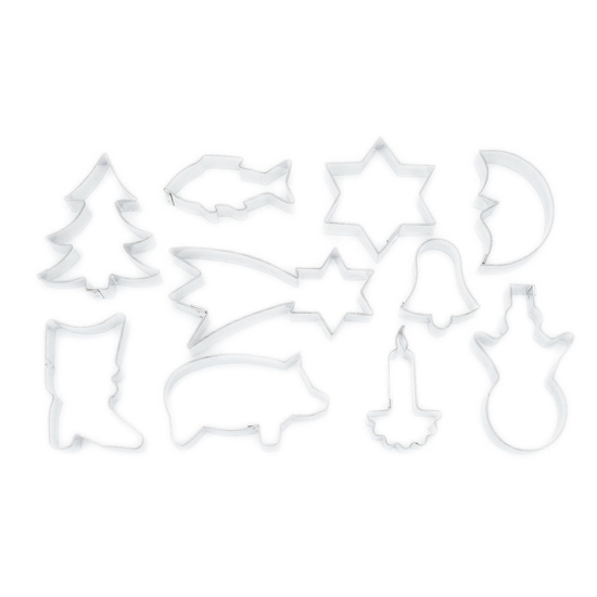 Unter den Ausschnitten gibt es natürlich den traditionellen Weihnachtsbaum, sowie andere Symbole von Weihnachten, wie ein Karpfen, ein Schneemann, ein Komet, ein Stern, ein goldenes Schwein, eine Kerze, eine Glocke, der Mond und ein Stiefel, der über die Schulter fliegt. Die entstandenen Formen werden dank der scharfen Unterkanten der Ausstechformen schön präzise sein, Sie müssen sich auch bei stärkerem Druck keine Sorgen um Ihre Finger machen, die Oberkante des Werkzeugs ist umgefaltet und so leicht abgerundet. Sie sind leicht zu reinigen und zu waschen, dank des hochwertigen Materials werden sie Ihnen viele Jahre lang dienen. Jetzt ist es an der Zeit, sich so schnell wie möglich auf die Weihnachtsfeiertage zu freuen!