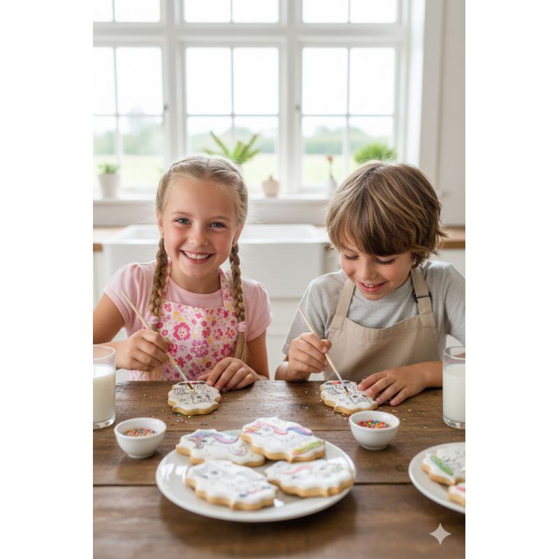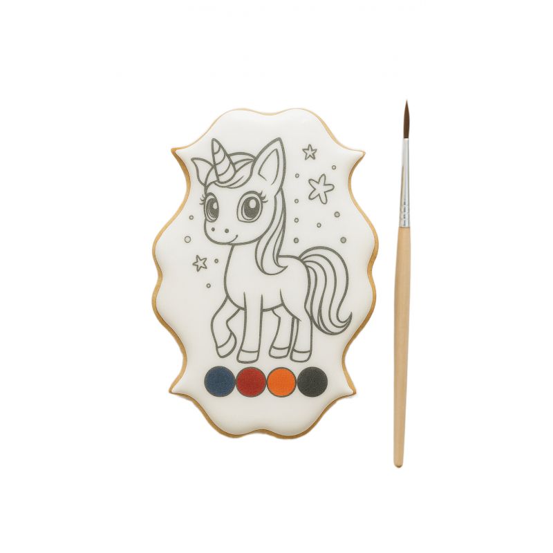 Dieser duftende Lebkuchen in der Form eines eleganten Einhorns ist mit weißem Zuckerguss bedeckt und bereit zum Ausmalen mit essbaren Lebensmittelfarben. Zum Lieferumfang gehört auch ein Pinsel, sodass nur etwas Wasser benötigt wird und das magische Malen beginnen kann.
