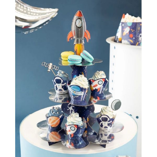 Cupcake-Ständer ist eine großartige Idee für eine praktische Tischdekoration, besonders wenn er wie eine Weltraumsrakete aussieht. Auf ihm platzierte Muffins bilden eine Komposition, die man mit den Augen essen möchte. Und der Anblick der lebendigen Farben zieht die Aufmerksamkeit der kleinen Partygäste auf sich und zaubert ihnen ein Lächeln ins Gesicht.