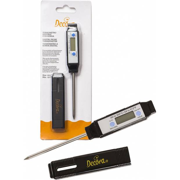 Digitales Thermometer mit Edelstahlsonde, einfache Anwendung in der Küche mit Messbereich -50 + 300 ° C, Länge der Nadel 7 cm. Ideal für schnelle und genaue Messung der Innentemperatur von Lebensmitteln, Getränken und Zubereitungen. Wird mit Schutzkappe geliefert. Verwendung: Geflügel, Schokolade, flüssige Speisen, Getränke und Zubereitungen.