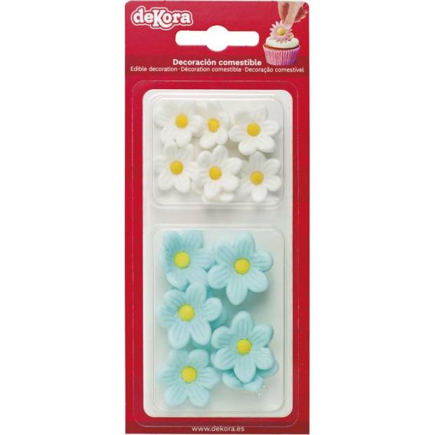 Satz Zuckerblüten von Dekora. Fantastisch als Dekoration für Torten und Cupcakes. Das Set enthält 7 weiße und 7 blaue Chrysanthemen in Form von Zuckerdekorationen. An einem kühlen, trockenen Ort (12-20°C) lagern und direktem Sonnenlicht fernhalten. Inhalt: 14 Dekorationen.