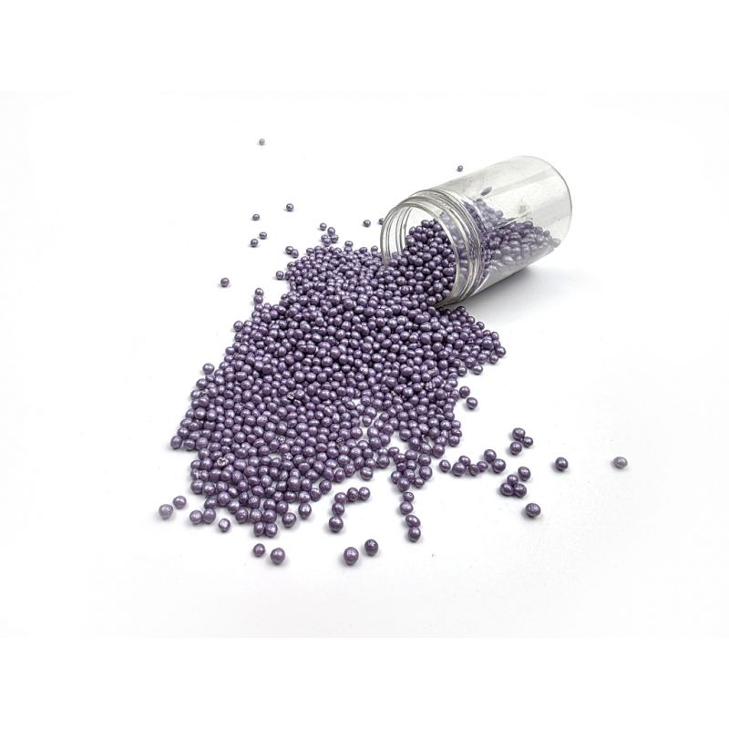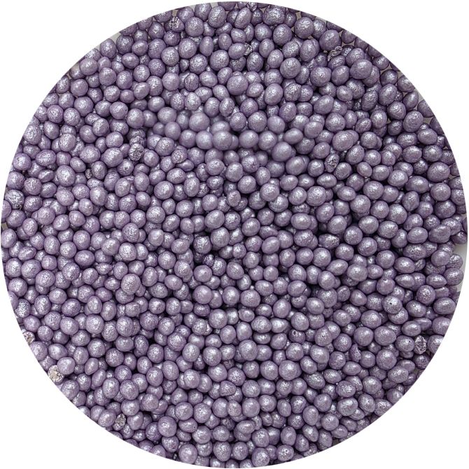 Lavendel-Perle-Pearls hergestellt aus Reisflocken und Zucker. Sie eignen sich perfekt zum Verzieren von Kuchen, Eis, Süßigkeiten und Lebkuchen. Entdecken Sie den Zauber dieser Perlen, der jedes Dessert zu einem Kunstwerk macht. Sie sind mehr als nur Dekoration – es sind feine Akzente, die Ihren süßen Kreationen Glanz und Einzigartigkeit verleihen. Sie bestehen aus hochwertigsten Rohstoffen. Ihre Oberflächenbehandlung ist ein innovativer Ansatz zur Dekoration, der aus traditionellen essbaren Dekos hervorsticht. Falls Sie die Verzierung auf eine flauschige Creme streuen, kann Feuchtigkeit aus ihr die Streuung weich machen. Aber Vorsicht: Wenn die Verzierung länger auf feuchter Creme liegt, kann sich sogar Farbstoff aus der Streu lösen und auf die Oberfläche der Creme gelangen. Wenn Sie möchten, dass größere Teile der Dekoration beispielsweise auf einer Fondant-Torte haften, können Sie diese Art der Dekoration mit halbtrockener Schokolade oder Zuckerguss für Lebkuchen befestigen. Arbeiten Sie mit der Streu am besten über einer Schüssel oder einer Backform mit Rand.