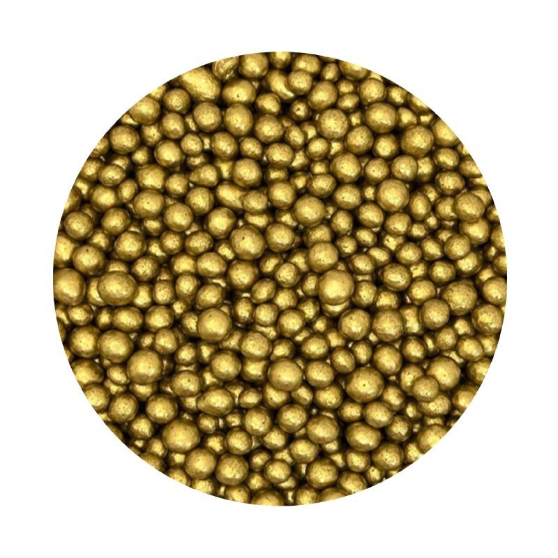 Perlen in antikt Goldtönen sind aus Reiskringeln und Zucker hergestellt. Sie eignen sich perfekt zum Dekorieren von Kuchen, Eis, Süßspeisen und Lebkuchen. Entdecken Sie den Zauber dieser Perlen, die jedes Dessert zu einem Kunstwerk machen. Sie sind mehr als nur Dekoration – sie sind feine Akzente, die Ihrem süßen Werk Glanz und Einzigartigkeit verleihen. Sie bestehen aus erstklassigen Zutaten. Ihre Oberflächenbehandlung ist ein innovativer Ansatz zur Dekoration, der sich von traditionellen essbaren Ornamenten abhebt. Wenn Sie die Dekoration über einen zarten Creme streuen, kann die Feuchtigkeit sie hindurchfeuchten. Aber Vorsicht, wenn die Dekoration länger auf einer feuchten Creme liegt, kann sich aus dem Streudekor auch Farbstoff lösen und das auf der Cremeoberfläche hinterlassen. Wenn Sie größere Teile der Dekoration beispielsweise auf einer Torte festkleben möchten, können Sie diese Art der Dekoration mit halbsteifer Schokolade oder Zuckerguss auf Lebkuchen befestigen. Arbeiten Sie beim Streudekor am besten über einer Schüssel oder einem Backblech mit Rand.