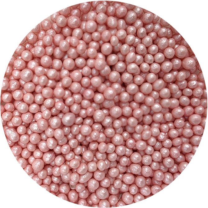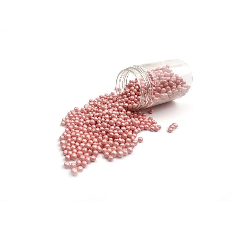 Rosa Perlmutt-Perlen aus Reisflocken und Zucker. Sie eignen sich perfekt zum Verzieren von Kuchen, Eis, Süßigkeiten und Plätzchen. Entdecken Sie den Zauber dieser Perlen, der jedes Dessert zu einem Kunstwerk macht. Sie sind mehr als nur Dekoration – es sind feine Akzente, die Ihren süßen Kreationen Glanz und Einzigartigkeit verleihen. Sie bestehen aus hochwertigsten Rohstoffen. Ihre Oberflächenbehandlung ist ein innovativer Ansatz zur Dekoration, der aus traditionellen essbaren Dekos hervorsticht. Falls Sie die Verzierung auf eine flauschige Creme streuen, kann die Feuchtigkeit sie anschwellen lassen. Aber Vorsicht, wenn die Verzierung länger auf der feuchten Creme liegt, kann sich aus dem Streugut auch Farbstoff lösen und dies auf der Cremedecke sichtbar werden. Wenn Sie möchten, dass größere Dekorationsteile z. B. auf einer Glatzier- oder Gussglas-Dekoration haften, können Sie diese Art von Dekoration mit halttrockener Schokolade oder Zuckerguss auf Plätzchen befestigen. Arbeiten Sie mit Streugut am besten über einer Schale oder einer Blechaus mit Rand.