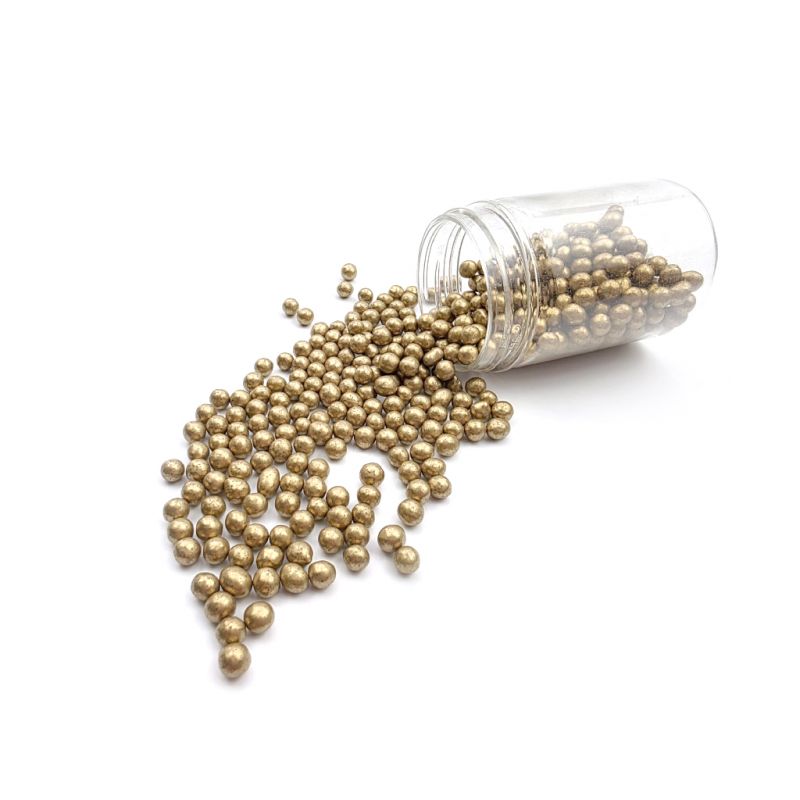7 mm große goldene Perlen sind aus Reiskrispen und Zucker hergestellt. Sie eignen sich perfekt zum Dekorieren von Torten, Eis, Desserts und Lebkuchen. Entdecken Sie den Zauber dieser Perlen, der jedes Dessert zu einem Kunstwerk macht. Sie sind mehr als nur Dekoration – sie sind winzige Akzente, die Ihrem süßen Werk Glanz und Einzigartigkeit verleihen. Sie bestehen aus den hochwertigsten Rohstoffen. Ihre Oberflächenbehandlung ist ein innovativer Ansatz zur Dekoration, der sich von traditionellen essbaren Schmuckstücken abhebt. Wenn Sie die Dekoration über einen zarten Cremé streuen, kann die Feuchtigkeit sie hindurchfeuchten. Aber Vorsicht, wenn die Dekoration länger auf einer feuchten Creme liegt, kann sich aus dem Streudekor auch Farbstoff lösen und das auf der Cremeoberfläche hinterlassen. Wenn Sie möchten, dass größere Teile der Dekoration an einer Überzugstorte haften, können Sie diese Art von Dekoration mit gehärteter Schokolade oder Zuckerguss auf Lebkuchen befestigen. Arbeiten Sie beim Streuen am besten über einer Schüssel oder einem Backblech mit Rand.