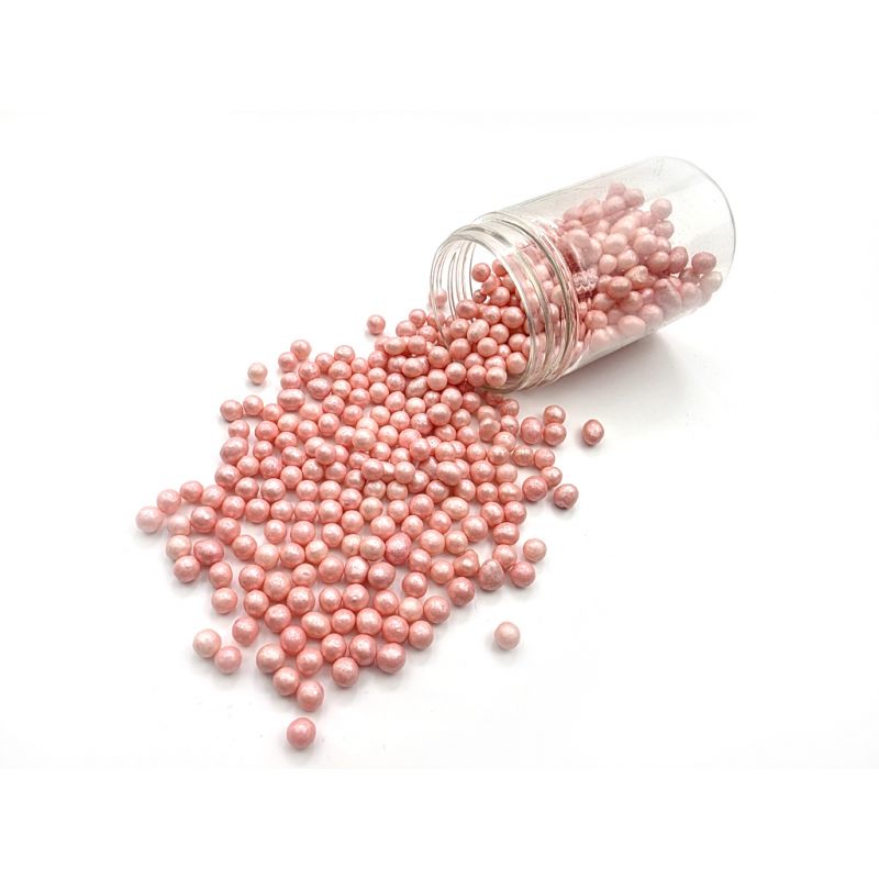 7 mm große roségoldene Perlen aus Perlmutt bestehen aus Reismehlstückchen und Zucker. Sie sind perfekt zum Dekorieren von Kuchen, Eis, Desserts und Lebkuchen. Entdecken Sie die Magie dieser Perlen, die jedes Dessert in ein Kunstwerk verwandeln. Sie sind mehr als nur Dekoration – sie sind feine Akzente, die Ihrem süßen Kunstwerk Glanz und Einzigartigkeit verleihen. Sie bestehen aus hochwertigsten Rohstoffen. Ihre Oberflächenbehandlung ist ein innovativer Ansatz zur Dekoration, der sich von traditionellen essbaren Verzierungen abhebt. Wenn Sie die Verzierung über eine feuchte Creme streuen, kann die Feuchtigkeit sie vom Crunch lösen. Aber Vorsicht: Wenn die Verzierung längere Zeit auf feuchter Creme bleibt, kann sich aus dem Streu auch Farbstoff lösen, und zwar auf der Oberfläche der Creme. Wenn Sie möchten, dass größere Teile der Dekoration beispielsweise auf einer Torte haften, können Sie diese Art von Dekoration mit halbtrockener Schokolade oder Zuckerguss auf Lebkuchen befestigen. Arbeiten Sie mit dem Streu am besten über einer Schüssel oder einem Backblech mit Rand.