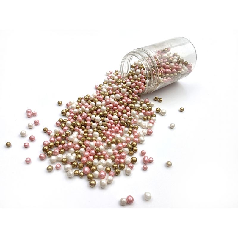 5 mm große rosa, weiße und goldene Perlen sind aus Reisbemischungen und Zucker hergestellt. Sie eignen sich perfekt zum Dekorieren von Torten, Eis, Desserts und Lebkuchen. Entdecke die Magie dieser Perlen, die jedes Dessert in ein Kunstwerk verwandeln. Sie sind mehr als nur Dekoration – sie sind zarte Akzente, die Ihren süßen Kreationen Glanz und Einzigartigkeit verleihen. Sie bestehen aus erstklassigen Zutaten. Ihre Oberflächenveredelung ist ein innovativer Ansatz zur Dekoration, der sich von herkömmlichen essbaren Zierdelen abhebt. Wenn du die Dekoration auf einen weichen Chantilly-Schaum streust, kann Feuchtigkeit daraus den Belag weicher machen. Aber Vorsicht: Wenn die Dekoration längere Zeit auf dem feuchten Creme liegt, kann sich aus dem Streudekor auch Farbstoff lösen und auf der Cremeoberfläche erscheinen. Wenn du größere Teile der Dekoration beispielsweise auf einer Ganache-Torte festkleben willst, kannst du diese Art von Dekoration mit halzartigem Schokolade oder Zuckerguss für Lebkuchen ankleben. Arbeite mit dem Streudekor am besten über einer Schüssel oder einem Backblech mit Rand.