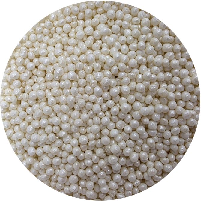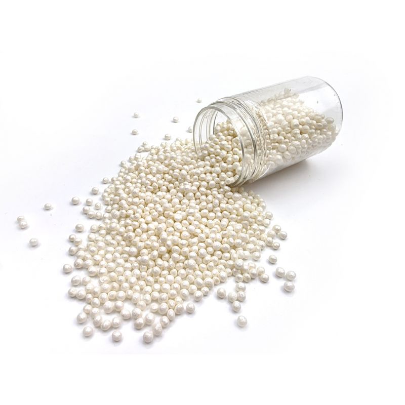 Weiße Perlen aus Reispfannkuchenstückchen und Zucker hergestellt. Sie eignen sich perfekt zum Verzieren von Kuchen, Eis, Desserts und Plätzchen. Entdecken Sie den Zauber dieser Perlen, die jedes Dessert zu einem Kunstwerk machen. Sie sind mehr als nur Dekoration – sie sind feine Akzente, die Ihrem süßen Werk Glanz und Einzigartigkeit verleihen. Sie bestehen aus den hochwertigsten Rohstoffen. Ihre Oberfläche ist eine innovative Herangehensweise an die Dekoration, die aus herkömmlichen essbaren Verzierungen herausragt. Wenn Sie die Dekoration über einen fluffigen Cremestock streuen, könnte Feuchtigkeit aus ihm die Streuung weicher machen. Aber Vorsicht, wenn die Dekoration länger auf der feuchten Creme bleibt, kann sich auch Farbstoff aus der Streu lösen und dies auf der Oberfläche der Creme hinterlassen. Wenn Sie möchten, dass größere Teile der Dekoration beispielsweise auf einer Fondant-Torte haften, können Sie diese Art von Dekoration mit haltrockener Schokolade oder Zuckerguss auf Plätzchen befestigen. Arbeiten Sie mit der Streuung am besten über einer Schüssel oder einem Backblech mit Rand.