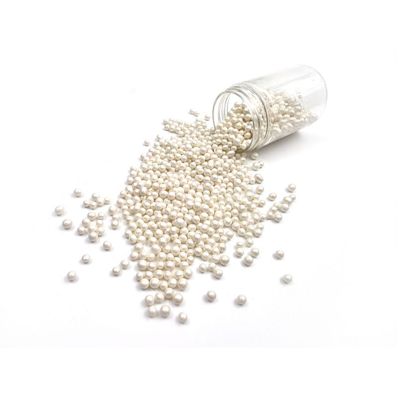 Weiße Perlen aus Reispfannkuchen-Schalen und Zucker hergestellt. Sie sind perfekt zum Dekorieren von Kuchen, Eis, Desserts und Plätzchen. Entdecken Sie den Zauber dieser Perlen, die jedes Dessert zu einem Kunstwerk machen. Sie sind mehr als nur Dekoration – sie sind feine Akzente, die Ihren süßen Kreationen Glanz und Einzigartigkeit verleihen. Sie bestehen aus den hochwertigsten Zutaten. Ihre Oberfläche ist eine innovative Herangehensweise an die Dekoration, die sich von traditionellen essbaren Verzierungen abhebt. Falls Sie die Dekoration über einen flauschigen Cremeteig streuen, kann Feuchtigkeit die Struktur weicher machen. Aber Vorsicht, wenn die Dekoration länger auf feuchter Creme liegt, kann sich aus dem Streudekor auch Farbstoff lösen und das auf der Oberfläche der Creme erscheinen. Wenn Sie möchten, dass größere Teile der Dekoration beispielsweise auf einer Fondant-Torte haften, können Sie diese Art der Dekoration mit halharder Schokolade oder Zuckerguss für Plätzchen befestigen. Arbeiten Sie mit Streudekor am besten über einer Schüssel oder einem Backblech mit Rand.