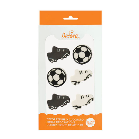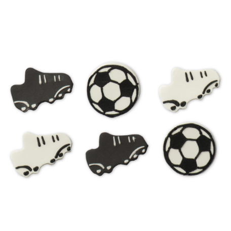 Kleine Zuckerkunst-anhänger zur Dekoration einer Fußballfans-Nascherei. Die Zucker-Deko ist für die endgültige Dekoration bestimmt, vor dem Gebrauch nicht aufwendig vorzubereiten. Einfach den Kuchen oder Cupcakes dekorieren und servieren.