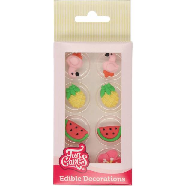FunCakes Sugar Decorations Tropical sind bunte Dekorationen, die Cupcakes, Keksen und Kuchen eine tropische Note verleihen – ideal für Partys mit tropischem Thema! Die Packung enthält 8 essbare Zucker-Dekorationen: Fackeln, Ananas, Wassermelonen und tropische Blumen.