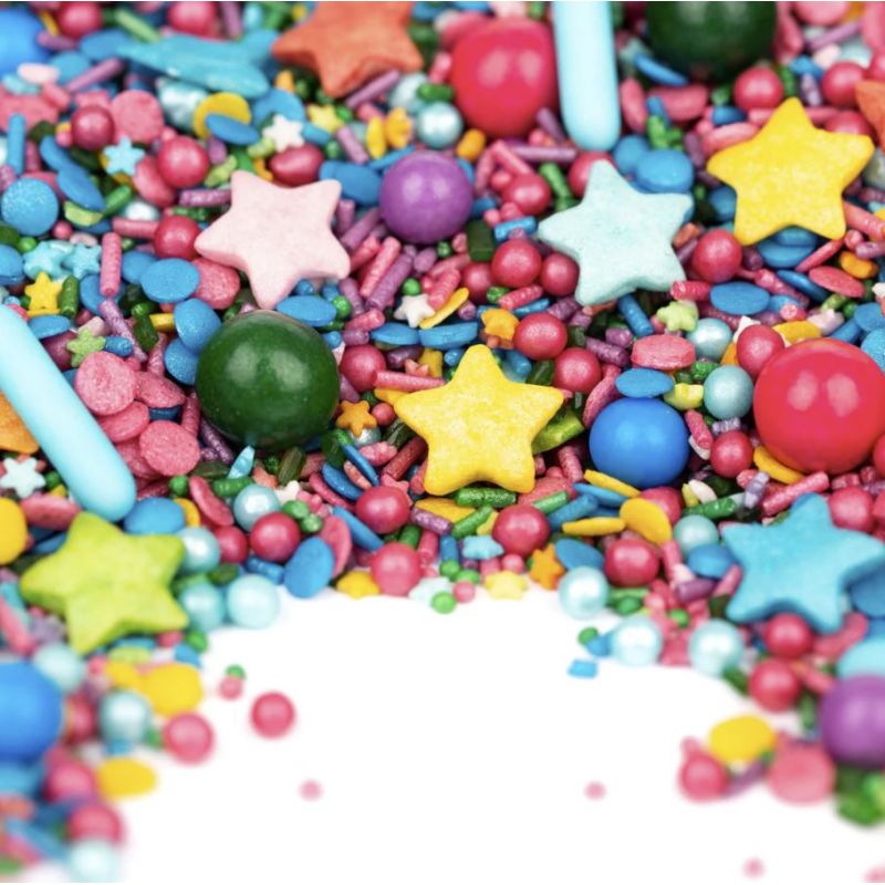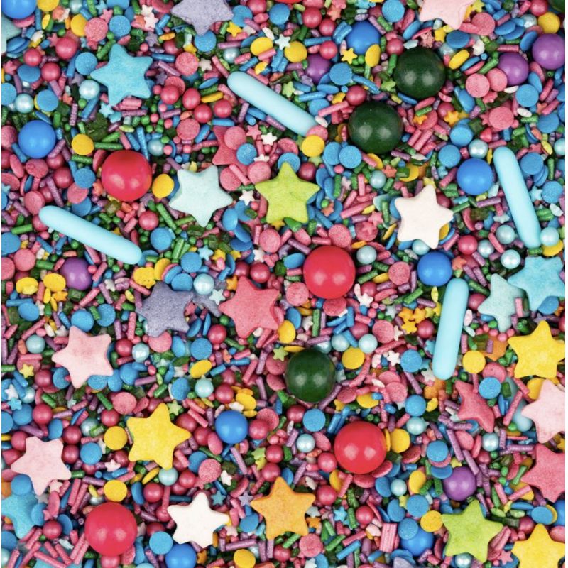 Super galaktischer StreuselMix Star Rain landet in deiner Küche wie eine kleine fallende Sternschnuppe und verwandelt deine Kuchen in die farbenfrohsten der Welt. Große wie kleine Astronauten werden erstaunt sein, wenn sie bei der nächsten Kindergeburtstagsparty deine planetare Torte im Weltraumstil entdecken. Erwartet Jubelrufe – schaltet bitte nur schon den Sicherheitsgurt ein und zieht ihn auf dem Weg zu StreuselHimmel nicht wieder ab. SternenRagen kommt völlig losgelöst von der Erde mit kleinen und großen Sternen, großen und kleinen Schokoladenkugeln, Konfetti und Perlenbestreuung – natürlich alles in leuchtenden Farben wie Blau, Grün, Gelb, Violett, Orange und einer extra Portion Rosa. Lange Stäbchen enthalten dünne, rohe Nudeln, mit Zucker überzogen. Sie gehören zwar zu den hübschesten, aber auch zu den schwersten, die unsere Mischungen zu bieten haben. Genießen Sie es daher mit Maß. Kugeln: Unsere mittleren und großen Kugeln sind alle köstlich mit feiner Schokolade gefüllt oder knusprig. Wunderbar! Mixen: Während des Transports fallen bei großen Streuseln und Schokoladenkugeln normalerweise in die Mitte der Dose. Um sich der vollen streufertigen Pracht zu erfreuen, kippen Sie die Dose einfach in eine Schüssel und lassen Sie sich verzaubern. Zutaten: Zucker, Glukose, Weizenstärke, Kartoffelstärke, Glukosesirup, Sonnenblumenöl, Reismehl, pflanzliches Öl (Kokos), Milchschokolade [Zucker, Kakao butter, Trockenvollmilch, Kakao-Masse, Emulgator: Sojalecithin, natürliches Vanillearoma], Kekspaste [Reismehl, Weizenmehl, Zucker, Weizenmalzmehl, Weizengluten, Salz], Weizenmehl, Stabilisator: Arabische Gum, Zuckerverester Fettsäuren, Agar; Stärke (Reis/Mais), Kakaobutter, Farbstoffe: E120, E153, E172, E174; Beschichtungsmittel: Lackharz, Wachs aus Bienenwachs, Carnaubawachs; Kann Spuren von Nüssen enthalten. Energie- und Nährstoffgehalt pro 100 g: Energie: 1725 kJ/407 kcal; Fett: 3,2 g, davon gesättigte Fettsäuren: 1,6 g; Kohlenhydrate: 93,6 g, davon Zucker: 88,2 g; Eiweiß: 0,8 g; Salz: 0,02 g