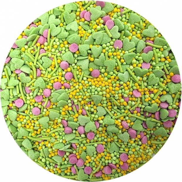 Farbige Mischung von Zuckerstreuseln wird als Ergänzung zu Ostertorten, -rollen, Cupcakes für Partys im natürlichen Stil, usw. I LOVE CAKES-Zuckerverzierung in vielen Farben und Formen helfen Ihnen, Muffins, Kuchen, Torten, Desserts, Cake Pops, Kekse und weitere Süßigkeiten auf interessante Weise zu dekorieren. Die Mischung enthält Herzen, Stäbchen, Konfetti und kleine Spreu. Die Streusel werden eine schöne Verzierung von Gebäck für verschiedenste Partys, Jubiläen oder eine Geburtstagstorte sein. Sie eignen sich hervorragend, um Süßigkeiten für den festlichen Tisch vorzubereiten. Die Streusel sind in einem praktischen Behälter verpackt, der eine einfache Dosierung und Lagerung ermöglicht. Lagern Sie sie an einem kühlen, trockenen Ort, fern von Sonneneinstrahlung. Wenn Sie die Verzierung auf eine feuchte Creme streuen, kann Feuchtigkeit sie erweichen. Aber Vorsicht: Wenn die Verzierung länger auf der feuchten Creme bleibt, kann sich auch Farbstoff aus den Streuseln lösen und auf der Oberfläche der Creme erscheinen. Wenn Sie möchten, dass größere Teile der Dekoration beispielsweise auf einer Fondant-Torte haften, können Sie diese Art von Verzierung mit dunklem festem Schokolade oder Zuckerguss auf Lebkuchen befestigen. Arbeiten Sie mit Streuseln am besten über einer Schüssel oder einem Backblech mit Rand.