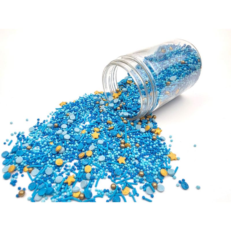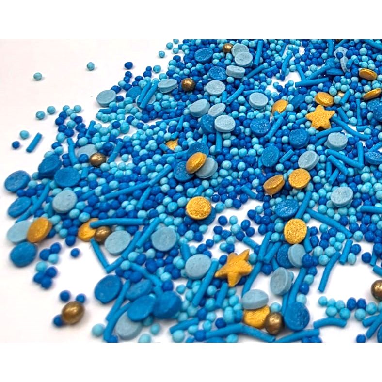Verleihen Sie Ihren Backkreationen eine individuelle Note mit einer Mischung aus blauen und goldenen Perlen in verschiedenen Formen. Diese dekorativen Partikel sind eine schnelle Möglichkeit, Torten, Cupcakes, Kekse, Lebkuchen, Cake Pops oder Eis elegant zu verzieren. Blau ist eine angenehme Farbe, die zu jeder Gelegenheit passt – von Weihnachten, über Valentinstag bis Halloween oder Ostern. Wenn Sie die Verzierung über eine feuchte Creme streuen, kann die Feuchtigkeit sie weich machen. Aber Vorsicht: Wenn die Verzierung länger auf der feuchten Creme bleibt, kann sich aus dem Streudekor Farbstoff lösen und dies auf der Oberfläche der Creme sichtbar werden. Wenn Sie größere Teile der Dekoration beispielsweise an einer Guss- oder Fondantdecke haften lassen möchten, können Sie diese Art der Verzierung auf Torten mit halbtrockener Schokolade oder Zuckerguss für Lebkuchen befestigen. Arbeiten Sie beim Streuen möglichst über einer Schüssel oder einem Backblech mit Rand. Die Verzierung passt hervorragend zu Zuckerpaste, Zuckerguss, Cremes und Schokolade. Sie verleiht dem Backwerk Tiefe, Kontrast und zieht Aufmerksamkeit auf sich – streuen Sie sie einfach über die Oberfläche der Torte, und Sie erzielen sofort den „Wow“-Effekt. Lässt sich leicht auftragen und ist sowohl für Hobby-Bäcker als auch für Profis geeignet.