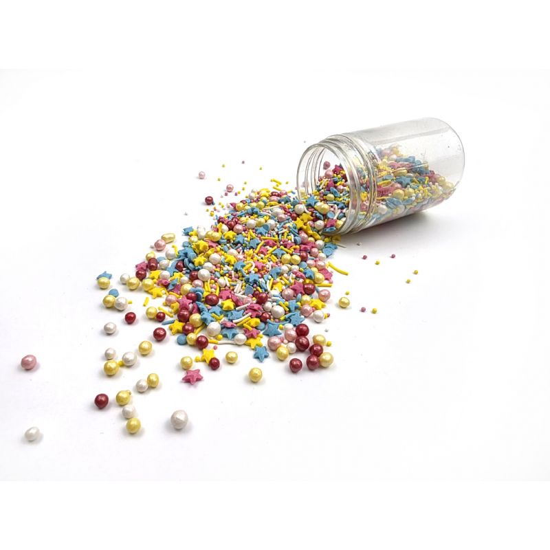 weißer Zucker, Vollkornmehl Mehl, Reismehl Mehl, stärkehaltiger Sirup, raffinierte Palmöl, modifizierte Stärke, Verdickungsmittel: E412, E415, E466, E414; Glanzmittel Kapol (Shellac, pflanzliches Öl), Talkum, Konservierungsmittel Sorbinsäure (E200), Lebensmittel-Farbstoffe: E102, E110, E124, E174, E122, E133, E132
