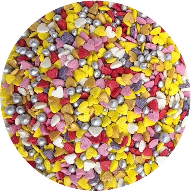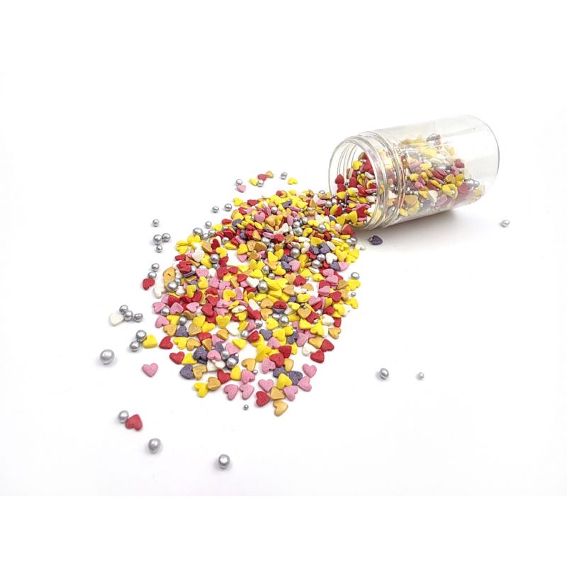 In einer praktischen Dose finden Sie eine Mischung aus bunten Herzchen und silbernen Perlen. Die Mischung ist als Ergänzung zu verschiedensten Desserts am Valentinstag, zum Dekorieren von Cupcakes, Torten, Kuchen, Desserts, Cake Pops, Plätzchen und weiteren Süßigkeiten geeignet. I LOVE CAKES in verschiedenen Formen hilft Ihnen auf interessante Weise, Muffins, Torten, Kuchen, Desserts, Cake Pops, Kekse und weitere Süßigkeiten zu dekorieren. Streudekorationen werden eine schöne Verzierung für Backwaren auf verschiedensten Partys, Jubiläen oder Geburtstagskuchen sein. Zuckerstreu-Dekorationen eignen sich bei der Zubereitung von Süßspeisen für ein süßes Buffet. Die Streudekorationen sind in einer praktischen Dose verpackt, die eine einfache Dosierung und Lagerung ermöglicht. Bewahren Sie sie an einem kühlen, trockenen Ort und vor Sonneneinstrahlung geschützt auf. Wenn die Dekoration auf eine weiche Creme gestreut wird, kann Feuchtigkeit sie weicher machen. Aber Vorsicht: Wenn die Dekoration längere Zeit auf feuchter Creme liegt, kann sich Farbstoff aus der Streudekoration lösen und auf die Oberfläche der Creme gelangen. Wenn Sie möchten, dass größere Teile der Dekoration beispielsweise auf einer Fondant-Torte haften, können Sie diese Art von Dekoration mit halbfester Schokolade oder Zuckerguss für Lebkuchen an die Torte kleben. Arbeiten Sie mit Streudekorationen am besten über einer Schüssel oder einem Backblech mit Rand.