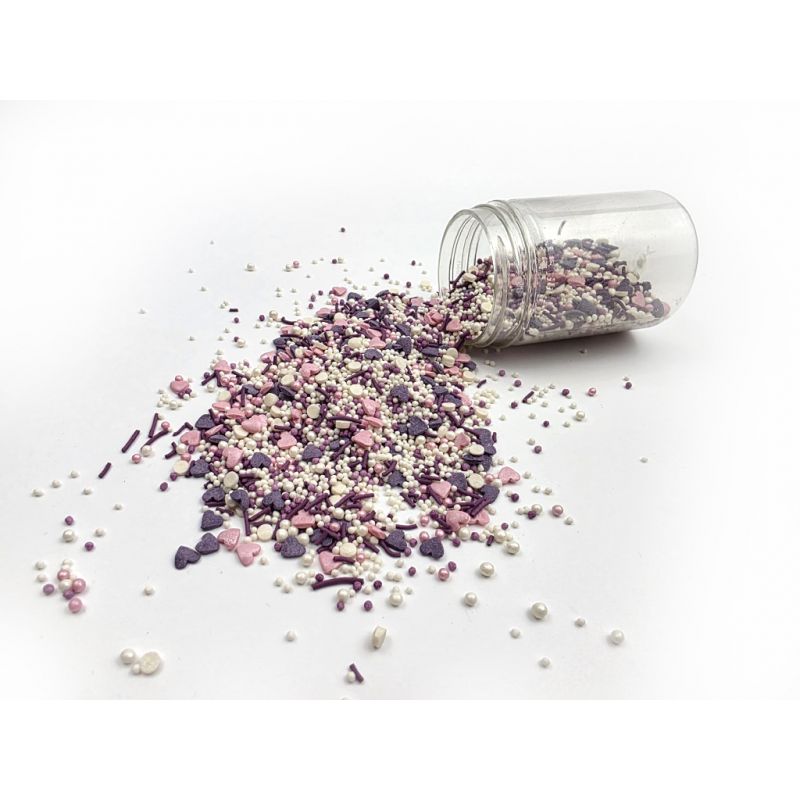 Zuckerstreusel sind ein unverzichtbares Produkt, um Backwaren und andere Desserts zu verfeinern. Sie sind einfach zu verwenden und ihre Wirkung kann überwältigend sein. Vor allem, wenn die Streusel in dieser lila Mischung vorliegen. Einzigartige Elemente machen aus jedem Dessert den Mittelpunkt der Aufmerksamkeit. Sie gelten als Hauptdekorationselemente vieler Backwaren und anderer Desserts. Sie sind bezaubernd und dezent anzusehen und hinterlassen gleichzeitig einen enormen Eindruck. Sie haben eine harte Struktur und schmelzen weder in Eis noch in Sahne. Wenn man die Verzierung auf eine luftige Creme streut, kann die Feuchtigkeit sie aufweichen. Aber Vorsicht: Wenn die Verzierung länger auf feuchter Creme liegt, kann sich sogar ein Farbstoff von den Streuseln lösen und sich auf die Cremeoberfläche setzen. Wenn Sie möchten, dass größere Teile der Dekoration beispielsweise auf einer Glasur- oder Backtorte haften, können Sie diese Art von Verzierung mit halbtrockener Schokolade oder Zuckerguss auf Lebkuchen festkleben. Arbeiten Sie mit Streuseln am besten über einer Schüssel oder einem Backblech mit Rand.