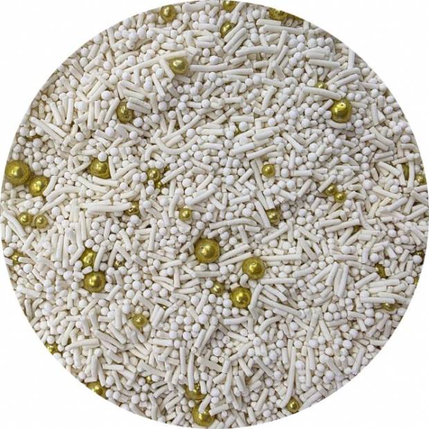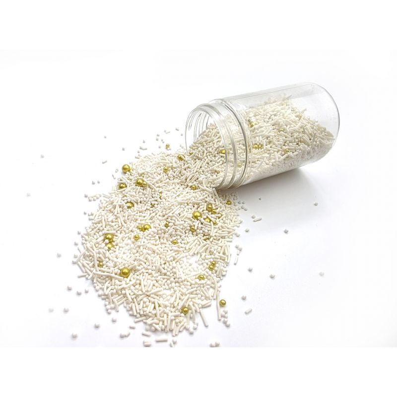 Die Hochzeitsschmuck ist eine Mischung aus weißen Stäbchen und goldenen Perlen, die Sie zum Dekorieren von Hochzeitstorten, Desserts, Cupcakes, Lollipop-Cake-Lollies und weiteren Desserts für die Hochzeitsfeier verwenden können. Die einzigartigen Elemente machen aus jedem Dessert den Blickfang. Sie gelten als Hauptdekorationselemente vieler Backwaren und anderer Desserts. Sie sind bezaubernd und dezent anzusehen und hinterlassen zugleich einen enormen Eindruck. Sie haben eine harte Struktur und lösen sich weder in Eis noch in Sahne auf. Die Streusel sind in einem praktischen Behälter verpackt für einfache Dosierung und Lagerung. Lagern Sie sie an einem kühlen und trockenen Ort, fern von Sonnenlicht. Wenn Sie die Verzierung auf eine luftige Creme streuen, kann Feuchtigkeit aus ihr die Streusel erweichen. Aber Vorsicht, wenn die Verzierung längere Zeit auf einer feuchten Creme liegt, kann sich aus dem Streuseln auch Farbstoff lösen und sich auf der Cremeoberfläche absetzen. Wenn Sie möchten, dass größere Teile der Dekoration beispielsweise auf einer Fondant-Torte haften bleiben, können Sie diese Art von Verzierung mit halstrockener Schokolade oder Zuckerguss für Lebkuchen am Kuchen befestigen. Arbeiten Sie mit Streuseln möglichst über einer Schüssel oder einem Backblech mit Rand.