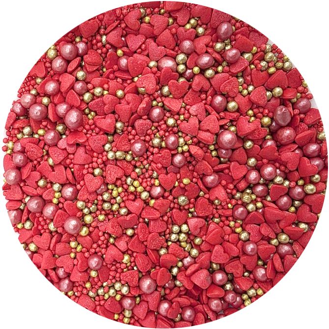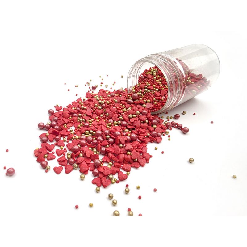Mix roter und goldener Herzchen, Perlen und feine Mückerchen wird als Ergänzung zu Valentinstags-Desserts, Cupcakes, Babyshower-Torten, Partys im Barbie-Stil usw. geschätzt. I LOVE CAKES in verschiedenen Formen helfen dir auf interessante Weise, Muffins, Torten, Kuchen, Desserts, Cake Pops, Kekse und andere Süßigkeiten zu verzieren. Streuungen werden eine schöne Verzierung für Gebäck auf verschiedenen Partys, Jubiläen oder einer Geburtstagstorte sein. Zuckerstreusel eignen sich gut für die Vorbereitung von Leckereien am süßen Buffet.