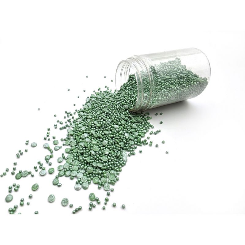 Universell, bunt und lecker. Die Mischung besteht aus grünen Konfettis und Perlen in metallischer Ausführung. Diese Art von Streudekor ist einfach perfekt. Ihre Farben kommen ebenso zur Geltung wie ihre Formen. Das ganze Ensemble wirkt jedoch nicht prunkvoll, sondern eher sehr stimmig. Trotz der Vielfalt kann man alle Elemente leicht zum Dekorieren einer einzigen Torte verwenden. Das Streudekor wird zum Verzieren verschiedener süßer Backwaren verwendet. Das können Kuchen, Gebäcke, Cupcakes oder Eisdesserts sein, ebenso wie Torten, Lebkuchen oder andere Kekse. Zucker-Konfetti hat viele Vorteile, wie die unglaublich einfache Handhabung. Legen Sie sie einfach auf das von Ihnen gewählte Backprodukt. Eine schöne und einzigartige Dekoration, in wenigen Momenten fertig und bequem Zuhause hergestellt. Geeignet für die verschiedensten Anlässe. Verändert nicht den Geschmack Ihrer Kreationen. Wenn Sie das Dekorieren auf eine luftige Creme streuen, kann Feuchtigkeit daraus das Streudekor weich machen. Aber Vorsicht, wenn das Dekor länger auf feuchter Creme liegt, kann sich aus dem Streudekor auch Farbstoff lösen und dies kann sich auf die Oberfläche der Creme übertragen. Wenn Sie möchten, dass größere Teile der Dekoration beispielsweise auf einer bedeckten Torte haften, können Sie diese Art von Dekor auf Torten mit halftrockener Schokolade oder Zuckerguss auf Lebkuchen kleben. Arbeiten Sie das Streudekor am besten über einer Schüssel oder auf einem Backblech mit Rand. Inhaltsstoffe: weißer Zucker, hochwertiges Weizenmehl, Stärkesirup, raffiniertes Palmöl, modifizierte Stärke, Verdickungsmittel: E412, E415, E466, E414; Glanzmittel Kapol (Schellack, pflanzliches Öl), Talkum, Lebensmittelfarbstoffe: E102, E133, E124, E174. Nährwertangaben pro 100 g Produkt: Fett - 3,4 g, davon gesättigte Fettsäuren 0,19 g, Kohlenhydrate - 84,6 g, davon Zucker - 59 g, Eiweiß - 3,6 g, Salz - 0,001 g Energiewert (Kalorien) pro 100 g Produkt: 375 kcal (1537 kJ).