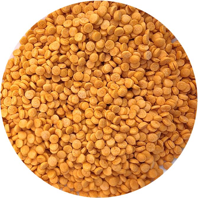 weißer Zucker, hochwertiges Weizenmehl, Stärkersirup, raffinierte Palmölf, modifizierte Stärke, Verdickungsmittel: E412, E415, E466, E414; Glanzmittel Kapol (Shellac, pflanzliches Öl), Talkum, Lebensmittelfarbstoff: E110.