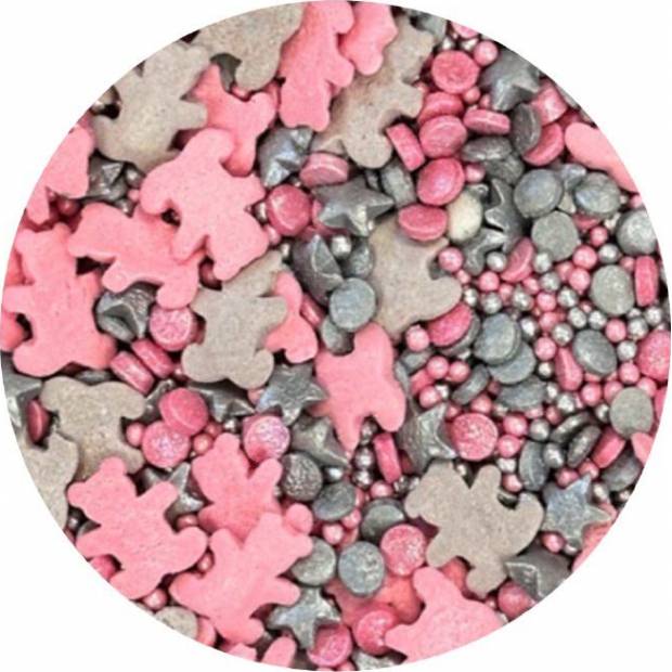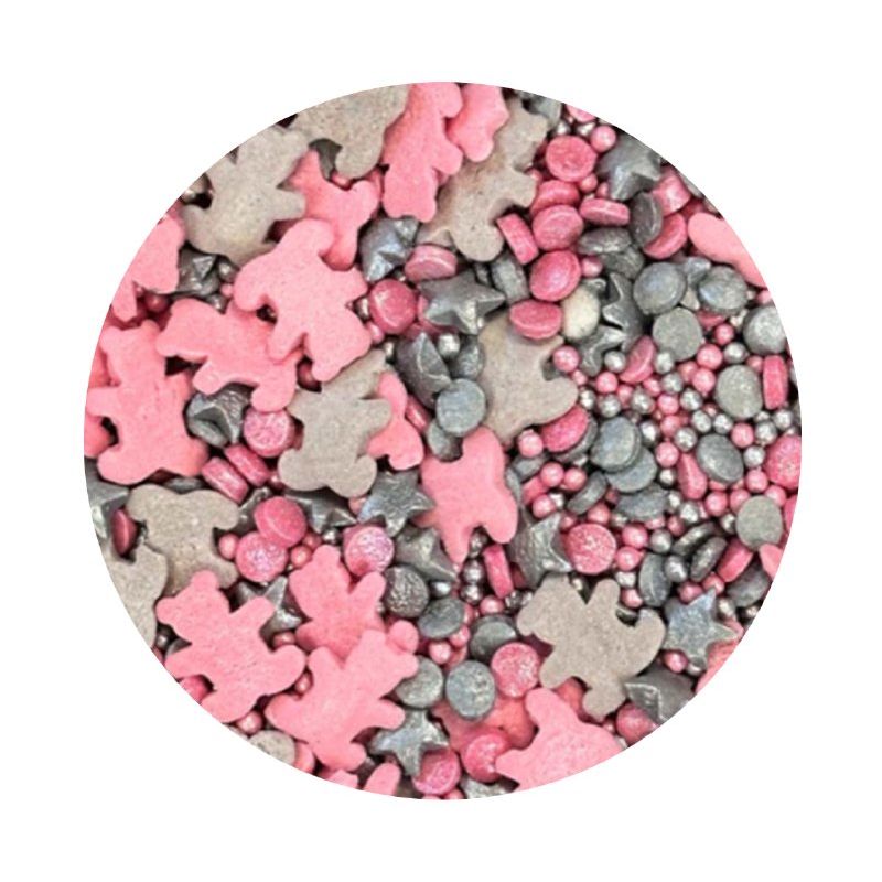 Zuckerausstechungen in Form von Teddybären, pink-silberfarbene Teddys, perfekt zum Dekorieren von Kuchen, Eis, Desserts und Plätzchen. Entdecken Sie den Zauber dieser essbaren Dekorationen, die jedes Dessert in ein Kunstwerk verwandeln. Es sind winzige Akzente, die Ihrem süßen Schaffen Glanz und Einzigartigkeit verleihen. Sie bestehen aus hochwertigsten Rohstoffen. Ihre Oberflächenbehandlung ist ein innovativer Ansatz zur Dekoration, der sich von traditionellen essbaren Schmuckstücken abhebt. Wenn Sie die Streu auf eine zarte Creme streuen, kann Feuchtigkeit sie weicher machen. Aber Vorsicht, wenn die Dekoration zu lange auf feuchter Creme liegt, kann sich aus der Streu auch Farbstoff lösen und auf der Cremeoberfläche erscheinen. Wenn Sie möchten, dass größere Dekorationsstücke z. B. auf einer Glanz- oder Fondant-Torte haften, können Sie diese Art der Dekoration mit heller Schokolade oder Zuckerguss auf Plätzchen befestigen. Arbeiten Sie die Streu am besten über einer Schüssel oder einem Backblech mit Rand.