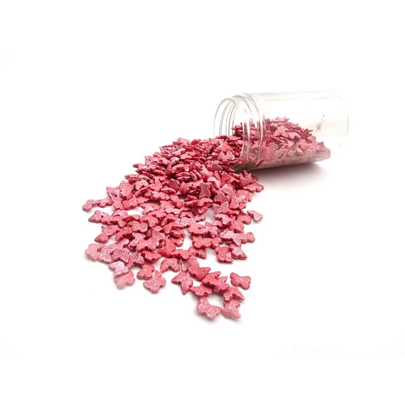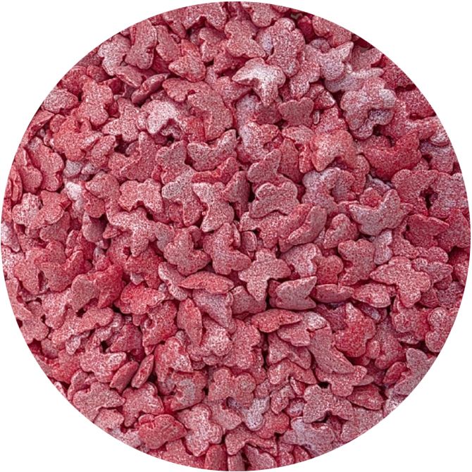 Große Streusel in Form roter metallischer Schmetterlinge zum Dekorieren von Kuchen, Cupcakes, Gebäck. Wunderschöne Dekorationen für Ihre Backwaren. Dank der Vielfalt der Streusel können Sie damit zum Beispiel einen Kuchen für ein Mädchen, einen Jungen oder einen Teenager dekorieren, der bunte Dekorationen liebt. Die Vielseitigkeit der Streusel bedeutet, dass Sie sie für verschiedene Anlässe verwenden können. Verleihen Sie Ihrem Backen einen einzigartigen Touch mit unseren essbaren Zuckerschmetterlingen in schönen Pastellfarben. Die Schmetterlinge eignen sich hervorragend zum Dekorieren von Kuchen, Muffins und anderem Gebäck, sie verleihen ihnen Eleganz und eine märchenhafte Note. Auf das fertige Gebäck streuen oder nach Belieben zu der gewünschten Form arrangieren. Wenn Sie die Verzierung auf eine cremige Füllung streuen, kann die Feuchtigkeit aus ihr die Streusel erweichen. Aber Vorsicht, wenn die Verzierung länger auf der feuchten Creme liegt, kann sich das Farbstoff aus den Streuseln lösen und auf die Oberfläche der Creme gelangen. Wenn Sie möchten, dass größere Teile der Dekoration beispielsweise am Einfärbeteig haften, können Sie diese Art der Dekoration am Kuchen mit halbtieferer Schokolade oder Zuckerguss für Lebkuchen befestigen. Arbeiten Sie mit Streuseln am besten über einer Schüssel oder einem Backblech mit Rand.